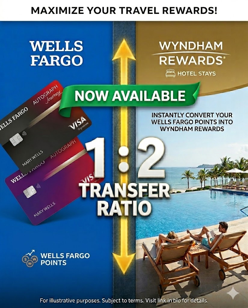 Wells Fargo just welcomed Wyndham Rewards to its Points Transfer program! Starting today, eligible cardholders can transfer their rewards at a 1:2 ratio.
