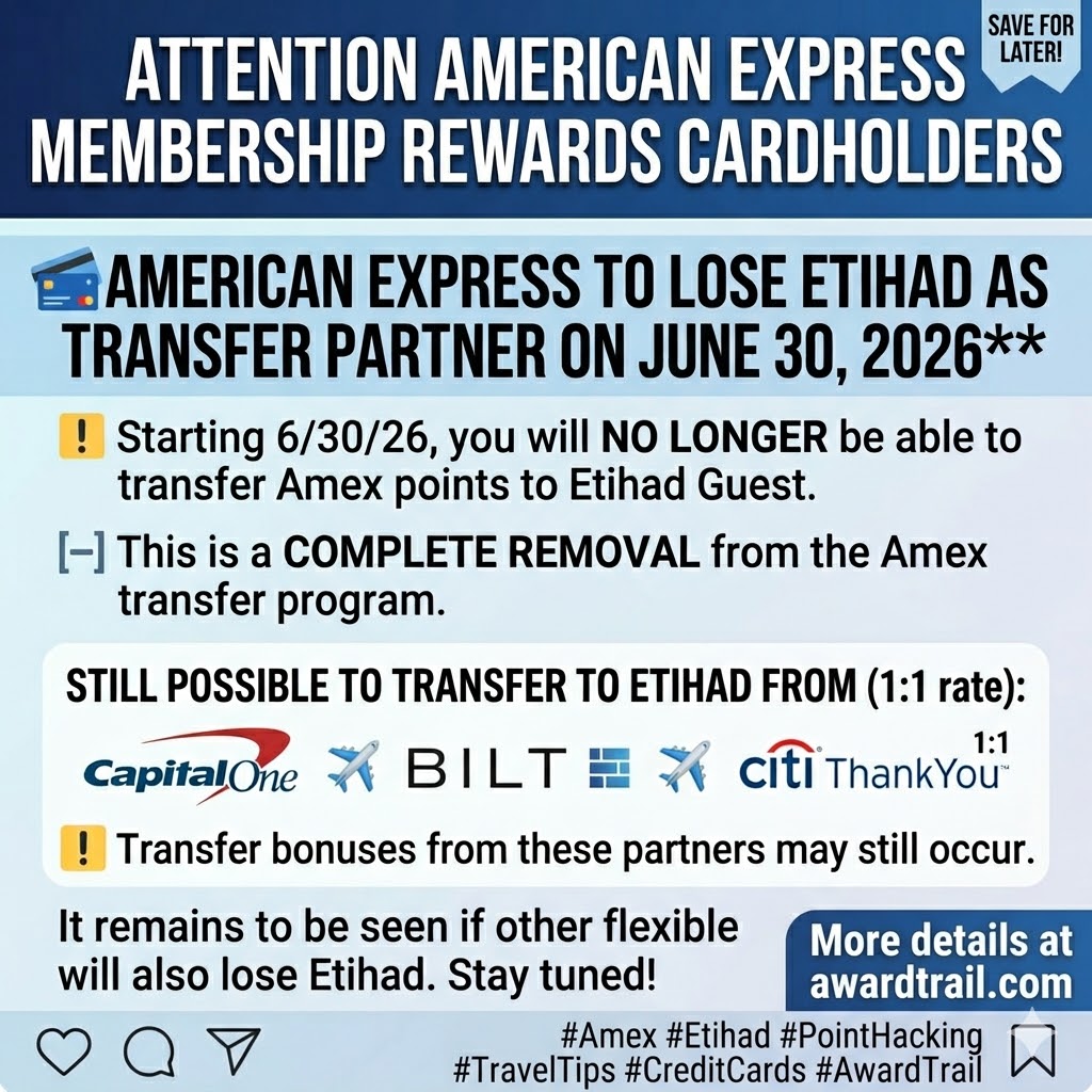 it’s official: American Express is losing Etihad Guest as a Membership Rewards transfer partner, effective June 30, 2026. This isn't just a devaluation—it's a complete removal.